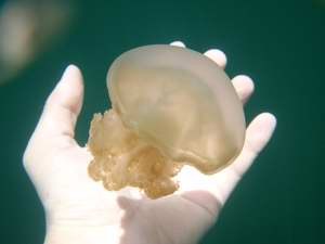 這邊的水母特別就在於它是沒有毒的 所以你可以摸它