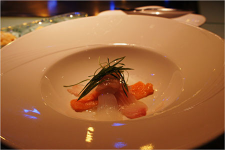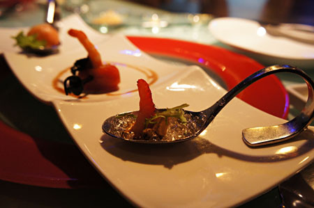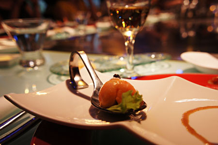 鵝肝冰酒凍、鮮蝦水果盅、魚子醬鮭魚球