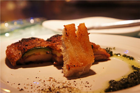 普羅旺斯雞排海鮮雙拼:當季蔬菜、香料和雞排結合,在鐵板小火慢煎,雞肉逐漸吸收蔬菜香甜的滋味, 搭配主廚特選圓鱈,肉質鮮嫩甜美,淋上特調青醬汁,充滿普羅旺斯風味的美味饗宴