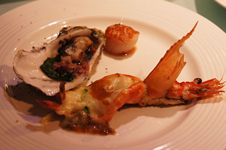 法式海鮮盤:焗烤草蝦以及生蠔、干貝搭配搭配以南極進口肉質彈Q的圓鱈下巴,以小火慢煎口感鮮嫩甜美,搭配地中海鹽提味讓綠螺及干貝嚐起來鮮美滑嫩,魚肉香甜有彈性